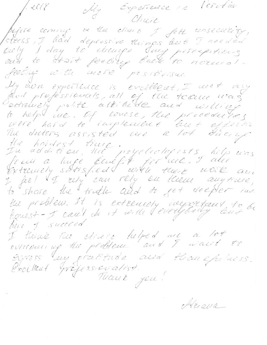 Creo que la clínica me ayudó mucho a superar el problema y por ello quiero expresar mi gratitud y agradecimiento. ¡Gracias!