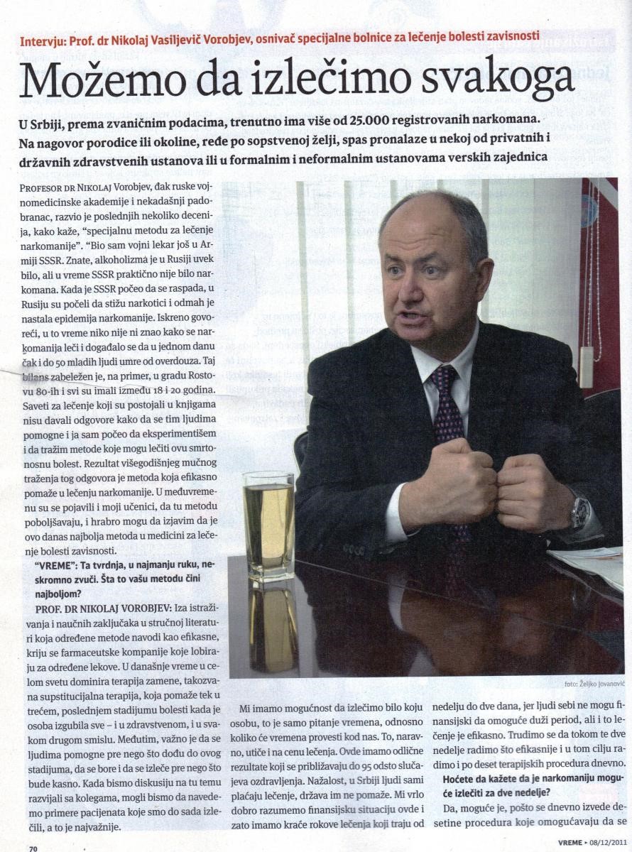 Entrevista: Prof. Dr. Nikolay Vasilievich Vorobiev, fundador del Hospital Especial para el Tratamiento de las Enfermedades Adictivas. Según datos oficiales, actualmente existen en Serbia más de 25.000 drogadictos registrados. A insistencia de la familia o el medio ambiente, rara vez por iniciativa propia, los adictos encuentran su salvación en ciertas instituciones de salud privadas y estatales o en instituciones formales e informales pertenecientes a comunidades religiosas