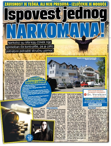Datos interesantes sobre la heroína - El ansia mental por la heroína ocurre después de 10-12 consumos. - 1 gramo de heroína cuesta entre 1000 y 1500 denarios en Belgrado. - La heroína que se vende en la calle contiene sólo 20% heroína, mientras que el resto son mezclas: soda, paracetamol y algunas veces los expertos han encontrado hasta polvo de lámparas incandescentes. - Un drogadicto puede atraer hasta diez nuevos usuarios en un año. - Después de un año de abstinencia de los narcóticos, los métodos modernos no revelan ninguna diferencia entre los tomogramas del ex-adicto y los de una persona sana.